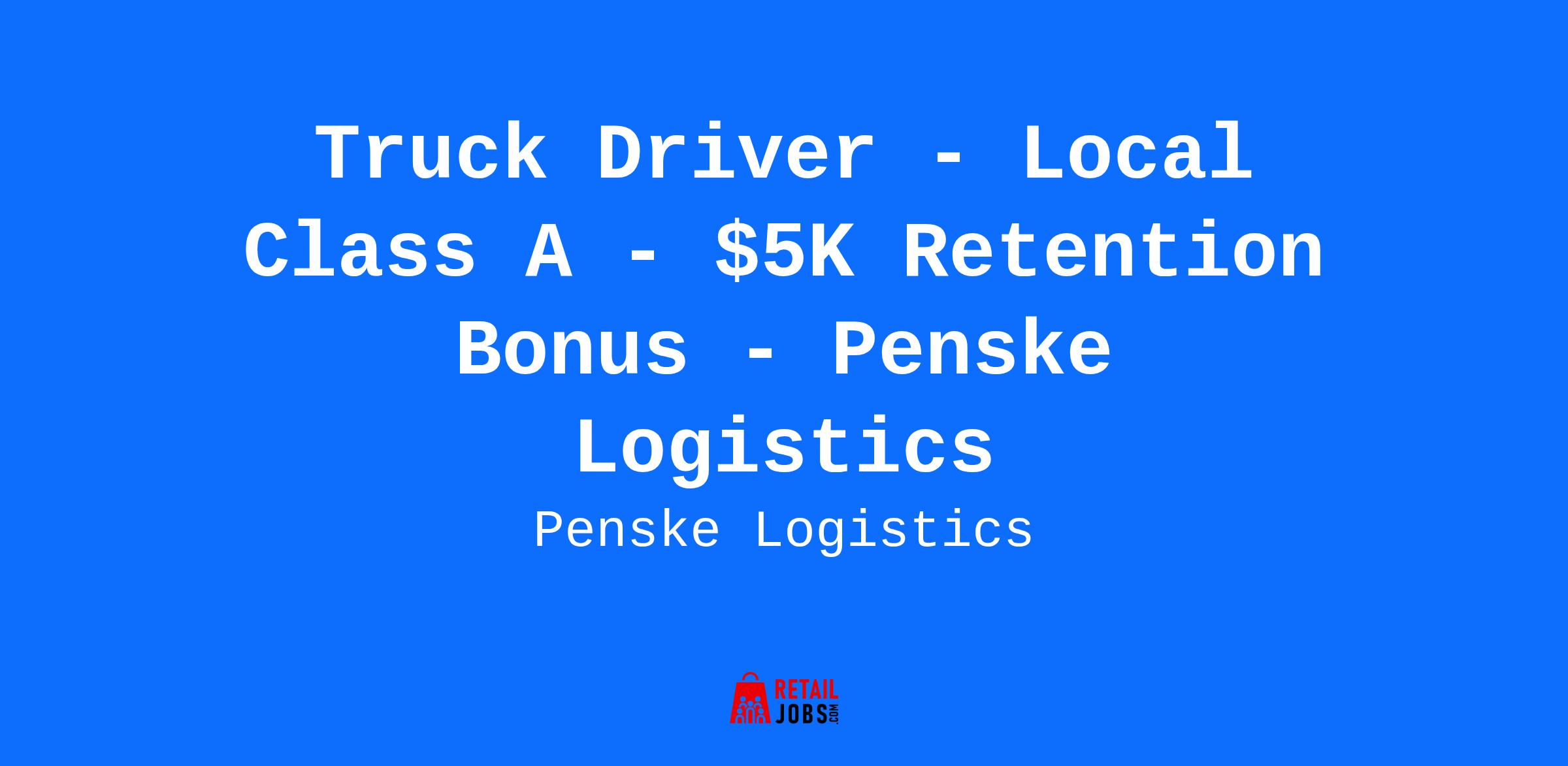 Truck Driver - Local Class A - $5K Retention Bonus - Penske Logistics Immediate Opportunities: Full-time Local Class A CDL Truck Drivers Average $95000 annually $3000 annual safety bonus $5000 retention bonus Local, Home Daily You will drive: Late model, Penske Truck Leasing trucks Best-in-class specs designed for comfort What you will do: Driver will deliver palletized groceries to local stores Home Daily Schedule: Multiple schedules available PM start time Additional incentives available for working a 5th and/or 6th day Comprehensive benefits package includes: Paid vacation and holidays day 1 Generous retirement benefits Excellent health care coverage-medical, dental, and vision Short and long-term disability; life and AD&D insurance Company-provided uniforms and safety footwear Employee discount benefit program Driver referral bonus program up to $5000 per referral Safety incentive program Premier Driver Recognition Program Our excellent benefits plan keeps associates and their families happy, healthy, and secure. To learn more visit Why Penske? Ready to put your truck-driving career in high gear? Make the shift and fuel your career as a CDL Class A Truck Driver for Penske. When you join Penske, you join a team of professional truck drivers committed to delivering products safely and on time. And we re proud to haul freight for some of the world s leading brands. (Yes, we re more than just the yellow trucks.) But it s more than that. It s about incredible customer service and building relationships with your accounts. When you drive for Penske, you re representing Penske, but you re also representing your clients. In fact, you ll probably be driving their branded trucks and wearing their uniform. You ll be on the move with Penske and so will your career. We have tons of training opportunities for you. And with locations across the nation, you can also move to a new city. Best of all, you ll be with a stable, nationwide company that is known for having the best equipment, great management, clear communication and a fantastic safety record. We pay every Friday, and for most of our driving positions, you re Home Daily. Yes, daily. Are you ready to take it to the next level? Come drive for Penske. Qualifications: CDL Class A required Currently hold, or ability to obtain, a non-excepted interstate DOT medical card required 1 year of documented tractor-trailer experience in the last 3 years required, or 2 years of documented tractor-trailer experience in the last 5 years 3 years DMV/MVR record with two or fewer moving violations or accidents Follow all federal and/or state laws, regulations, and/or agency rules, standards and guidelines Regular, predictable, full attendance is an essential function of the job Work the required schedule, work at the specific location required, complete Penske employment application, submit to a background investigation (to include past employment, education, and criminal history) and drug screening required This position is regulated by the Department of Transportation or designated as safety-sensitive by the company, and the ability to work in a constant state of alertness and in a safe manner is required. Associates must have the ability to accept responsibility for their own safety, as well as the safety of others. Physical Requirements: The physical and mental demands described here are representative of those that must be met by an associate to successfully perform the essential functions of this job. Reasonable accommodations may be made to enable individuals with disabilities to perform essential functions. The associate must be able to see and hear. Specific vision abilities required by this job include close vision, distance vision, peripheral vision, depth perception and the ability to adjust focus. While performing the duties of this job, the associate will be required to move frequently, stand, walk, and sit. The associate is frequently required to use hands to touch, handle, and feel, and to reach with hands and arms. The associate must be able to regularly lift and/or move up to 50lbs/23kg and occasionally lift and/or move up to 100lbs/45kg. The associate must be able to legally operate a motor vehicle and safely and frequently enter/exit the vehicle as well as the rear cargo area. Penske is an Equal Opportunity Employer. About Us About Penske Logistics Penske Logistics engineers state-of-the-art transportation, warehousing and freight management solutions that deliver powerful business results for market-leading companies. With operations in North America, South America, Europe and Asia, Penske and its associates help businesses move forward by increasing visibility and driving down supply-chain costs. Visit Penske Logistics to learn more.