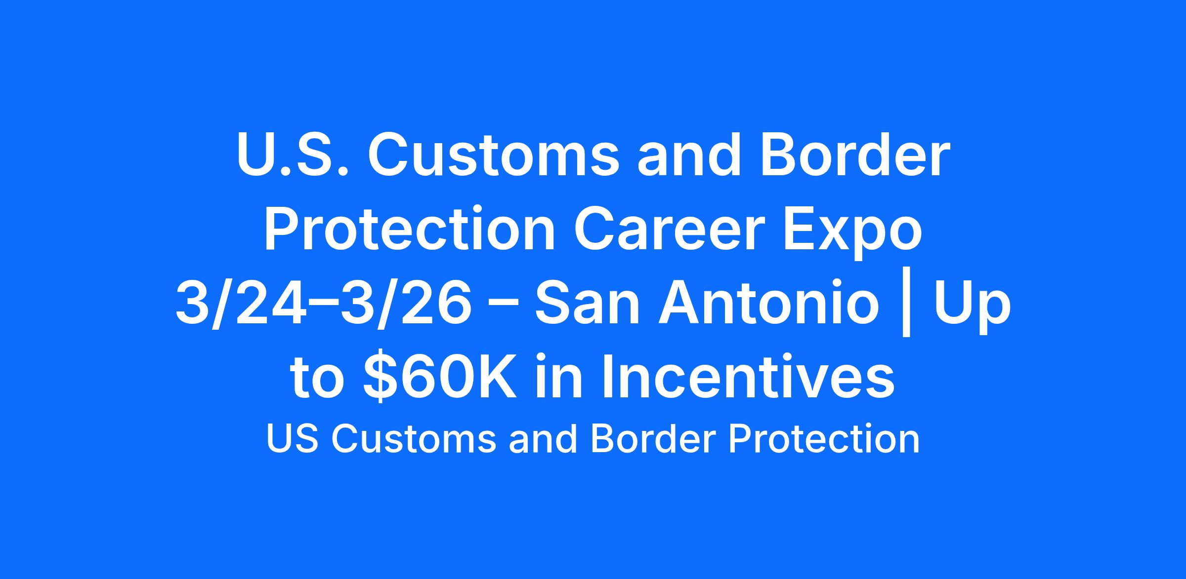 If you're ready to explore the rewards and challenges of serving in today's highly-skilled U.S. Customs and Border Protection, don't miss the live, three-day CBP Career Expo this March 24 – 26 in San Antonio, TX.​ Our expansive, in-person hiring event is free and open to all, with registration required in advance. Event hours will be:​ March 24 – 25, 2026, 9 AM – 8 PM CT​ March 26, 2026, 9 AM – 2 PM CT​ Recruiters will be on hand throughout the event to answer questions and provide valuable input, including resume tips. Plus, to help accelerate your application process, CBP is also offering onsite application submission.​ See what it takes to serve as part of the vital CBP mission, providing security for our nation's borders from those who threaten legitimate trade and travel, safety from harmful substances like fentanyl, and humanitarian aid to those in need.​ We will be recruiting for mission-critical roles in both law enforcement and mission operations support. Federal hiring regulations apply to all mission-critical positions. At a minimum, U.S. Citizenship is required.​ Federal civil service is a great place to start building a career in law enforcement and learn about the qualifications you'll need to get your career started. In addition:​ Border Patrol Agents that are Newly appointed can earn UP TO $60,000 IN INCENTIVES. Conditions apply.​ CBP Officers have UP TO $60,000 IN INCENTIVES available, paid $15,000 per year. Location based.​ ​ Air Interdiction Agents and Marine Interdiction Agents can receive $10,000 incentive upon successful completion of academy.​ ​ Specific location and schedule details will be provided to all registered attendees in advance. Register Today!