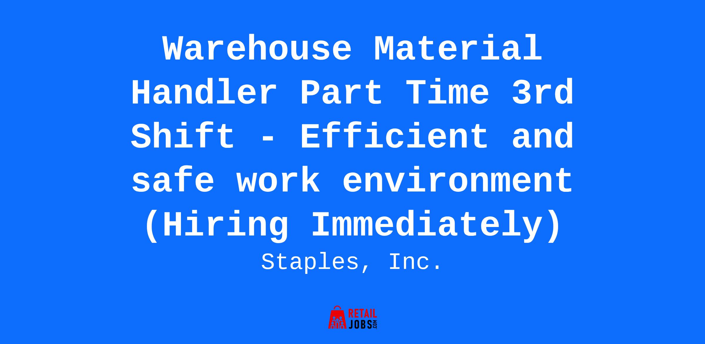 2:30am-8:00am/Monday-Friday Staples is business to business. Youre what binds us together. Our supply chain team is dedicated to meeting our customers needs both now and in the future. By pairing innovative technology with dynamic employees, we create smarter, more efficient ways to meet our customers needs faster. Our network of distribution, fulfillment, fleet, furniture installation and professional teams work together in fun and safe environments to deliver state-of-the-art products, services, and expertise to our customers. What youll be doing: As a Warehouse Delivery Material Handler, youll be manually loading trucks with products to be delivered to our customers. Youll be lifting, lowering and carrying product in a fast-paced environment and stacking empty pallets and maintaining a safe and clean workspace as you go. Safety is our utmost priority so, in this role, we will look to you to ensure safe work practices and embrace our safety culture. You will be essential to the success of Staples Supply Chain as we deliver to our customers. What you bring to the table: Ability to be MHEO certified and safely operate necessary material handling equipment as required. An ability and willingness to keep work area clean. An inclusive approach with your colleagues and customers to forge strong relationships and foster collaboration to resolve issues. An ability to adopt our safety procedures quickly and ensure safe work practices. An ability to work in a warehouse environment with seasonal temperature variations. Basic English language skills (both verbal and written communications). Qualifications: Whats needed- Basic Qualifications: 3 months related experience in a warehouse environment; or any equivalent combination of acceptable training, education, and experience. Ability to pass a drug screen to the extent permissible legally. If you are hired as a Full-Time associate, you must have the ability to work additional hours beyond scheduled shift; additional overtime hours will be required based on business need. Ability to lift, push or pull equipment/merchandise weighing up to 100 pounds. Must wear safety composite shoes. Ability to walk and stand 100% of the time. Must be at least 18 years old. Whats needed- Preferred Qualifications: High School Diploma/GED or equivalent work experience. We Offer: Competitive Pay: $20.75/hour (includes $2.00/hour Shift Differential) Receive a pair of work shoes after 30 days. Staples offers both Full-Time and Part-Time benefits. Some Full-Time benefits include: 112 Hours of PTO and Holiday Schedule (7 observed paid holidays 1 floating holiday) Online and Retail Discounts, Company Match 401(k), Physical and Mental Health Wellness programs, and more perks and benefits The physical demands described are representative of those that must be met by an employee to successfully perform the essential functions of this job. Reasonable accommodations may be made to enable individuals with disabilities to perform the essential functions. HTF At Staples, inclusion is an action word. It represents what we do to ensure that all employees feel valued and supported to contribute to their fullest potential. When we operate inclusively, diversity naturally follows. This is why we work hard to foster an inclusive culture, as we seek employees with unique and varied perspectives and areas of expertise. The result is a better workplace and innovative thinking that helps us exceed our customers expectations through the power of the people behind our iconic brand. Staples is an Equal Opportunity Employer. All qualified applicants will receive consideration for employment without regard to race, color, religion, age, sex, sexual orientation, gender identity, national origin, protected veteran status, disability, or any other basis protected by federal, state, or local law.